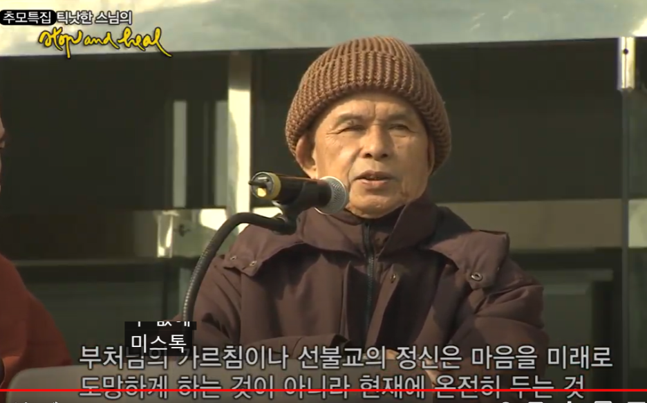 "부처님의 가르침이나 선불교의 정신은 마음을 미래로 도망가게 하는 것이 아니라 현재에 온전히 두는 것, 현재 안에서 삶의 경이로움을 접촉하게 하는 것입니다.