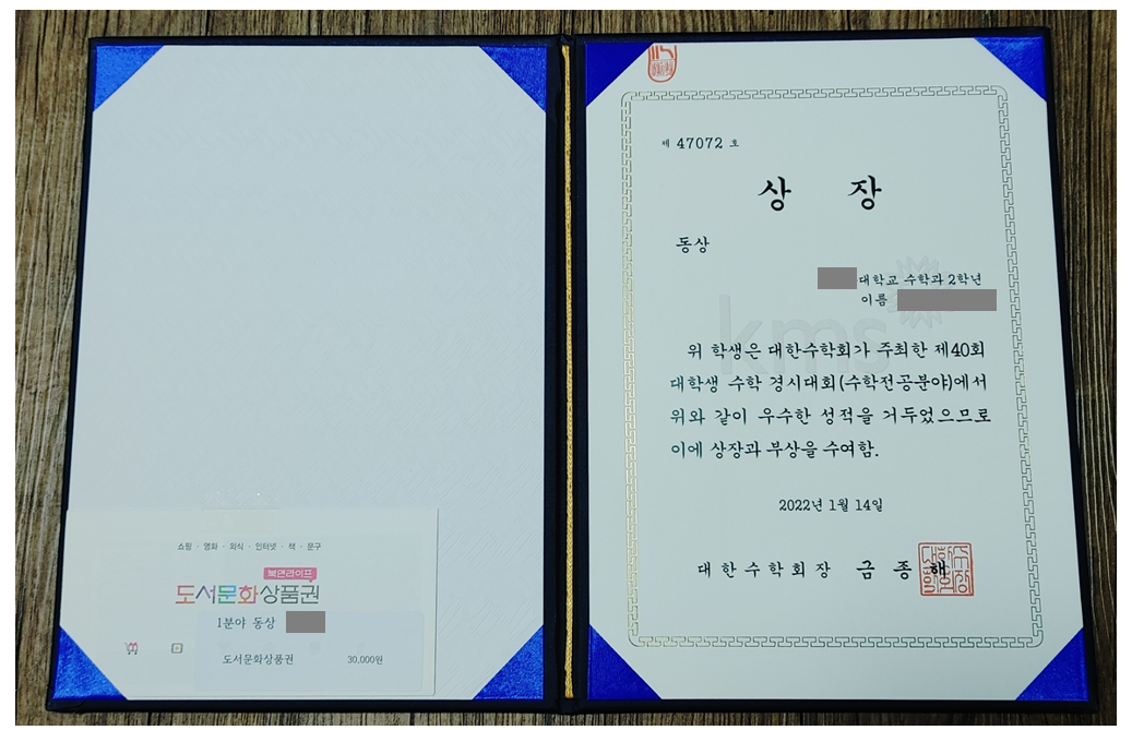 아들아, 드디어 대학생수학경시대회 상장이 우리 집으로 도착했다.